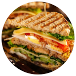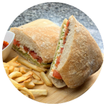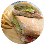 Pan Ciabatta dorado a la parrilla con Jamón de pavo, Queso mozarella, Jitomate, Alfalfa, Lechuga, Cebolla, Aguacate y el Aderezo de tu elección.