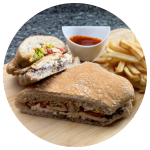 Pan tostado con jamón de pavo, tocino, pollo deshebrado, jitomate, cebolla, queso tipo americano y lechuga. Incluye Papas a la Francesa.