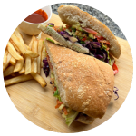 Pan Ciabatta dorado a la parrilla con Queso panela, Verduras salteadas (calabacín-pimiento-zanahoria), Col morada, Cebolla, Jitomate, Alfalfa y Lechuga. Aderezo de tu elección.