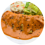 Pechuga de pollo sazonada a la plancha (poca grasa). Te enviamos la salsa y tortillas por separado. Acompáñala con arroz o ensalada verde y papas a la francesa o puré de papa.