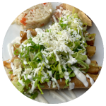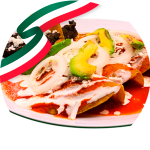 Tortilla de maíz (4) pasadas ligeramente en aceite, rellenas de huevo revuelto, pollo deshebrado o queso panela bañadas con salsa de frijol (picosita), rayadas con crema y coronadas con chorizo.
