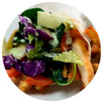 Tortilla de harina burrera pasada por la plancha con tenders de pollo empanizados, cebolla morada, pepino, col morada, lechuga, espinacas, jitomate y aderezo de tu elección.