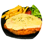 Milanesa de pollo empanizada cubierta con salsa Napolitana (muy Italiana de Jitomate), Jamón y gratinada con Queso Mozarella. Incluye agua de sabor de 16 oz. Elige tus acompañantes.