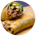 Tortilla de harina burrera pasada por la plancha con tiritas de carne de res asada, cebolla morada, lechuga, pepino, jitomate, papas a la francesa, queso panela y aderezo de tu elección.