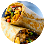 Tortilla de harina burrera pasada por la plancha con fajitas de pollo BBQ, granos de elote, frijoles enteros y pimientos. Aderezo BBQ.
