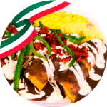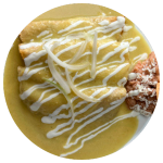 Tortilla de maíz (4) pasadas ligeramente en aceite, rellenas de pollo deshebrado o queso panela, bañadas con la salsa clásica cremosa de enchiladas verdes y gratinadas con queso. Acompáñalas con arroz o ensalada verde o frijoles refritos.