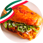 Pan barnizado y dorado en salsa de Chile Guajillo (no pica) y relleno de Papas con Chorizo, Lechuga, Crema y Queso fresco. Elige la Salsa que más te guste.