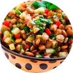 Platillo preparado con base de Lentejas y complementado con Piña/Mango, Aguacate, Cilantro, Cebolla, Pepino y Jitomate, marinado con jugo de limón y aceite de oliva. Acompañado con Tostadas.
